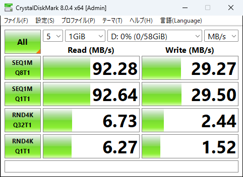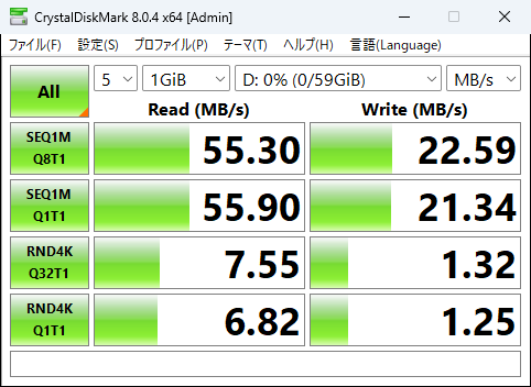 全く同じ環境・フォーマット形式 で手持ちの全く同じ型番の「HDMCSDX64GCL10UIJP3」の速度も計測してみました。