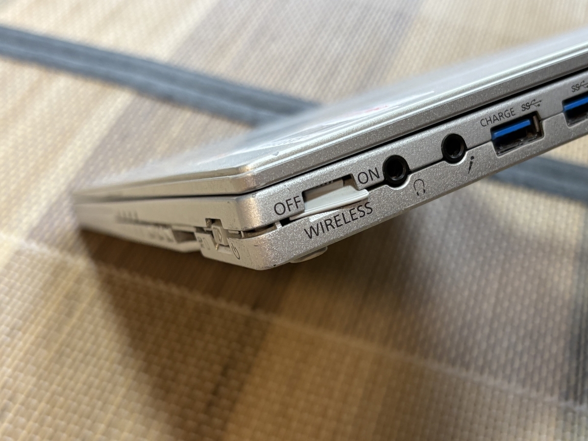 手前右のスライドスイッチを右側にスライドすることで電源が入ります。Let’note、右に電源スイッチがある機種と左にある機種が有り混乱しますね。