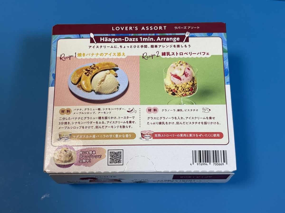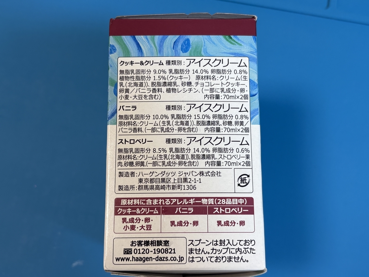 今回、頂いた種類は「ラバーズ アソート」、バニラ・ストロベリー・クッキー&クリームの3種類が2個づつ、計6個入りの製品です。別の種類で「クラシック アソート」バニラ・グリーンティー・ラムレーズンや期間限定の種類もあるようです。