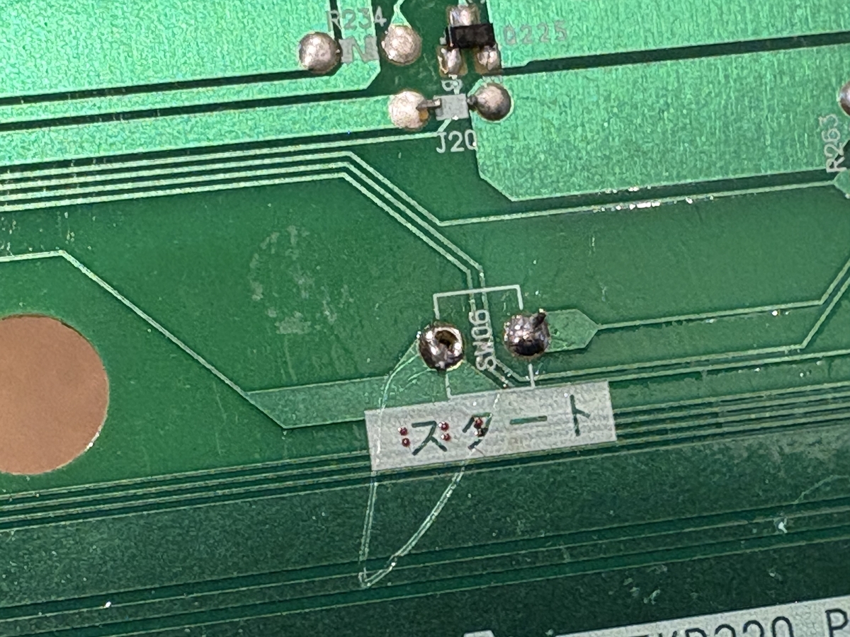 問題のスタートボタンです。丸形のタクトスイッチで足は2本、丸形であまり見かけない形です。基盤には分かりやすく「スタート」との記載もあります。