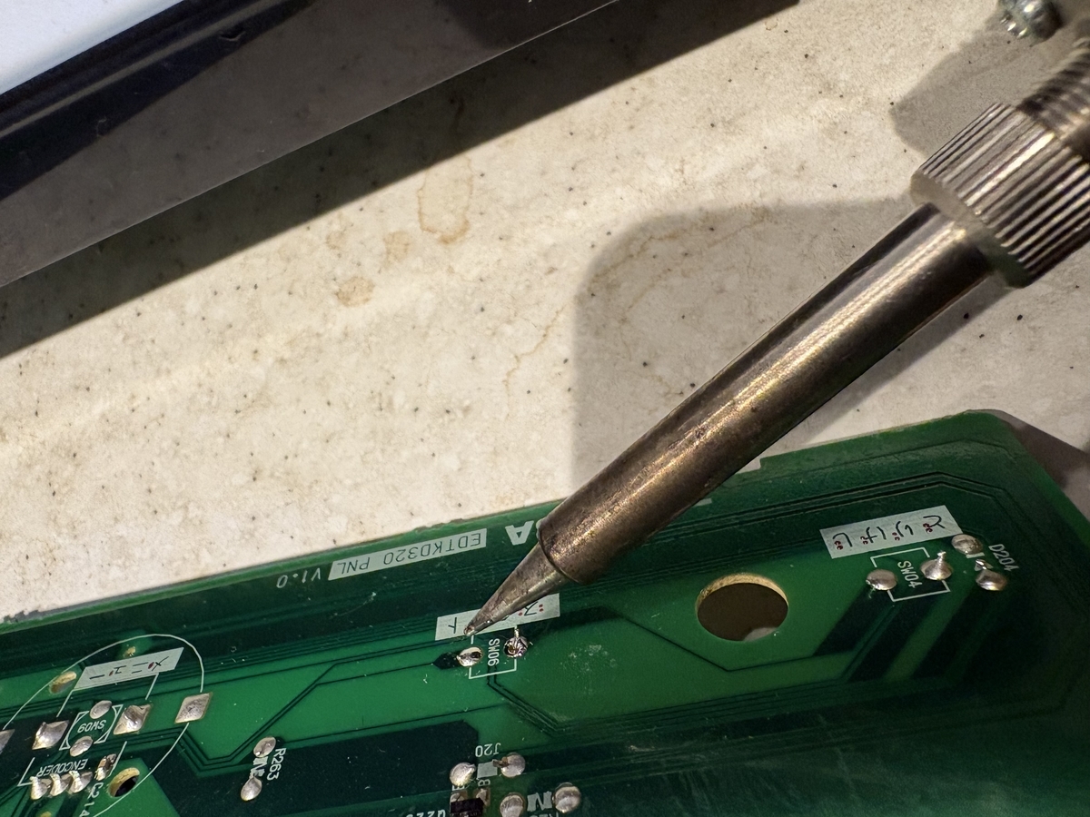 問題のスタートボタン、こちらを半田ごてで温め、半田吸い取り器で古い半田を取りました。スイッチは簡単に外れました。